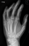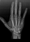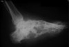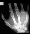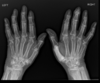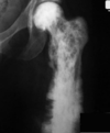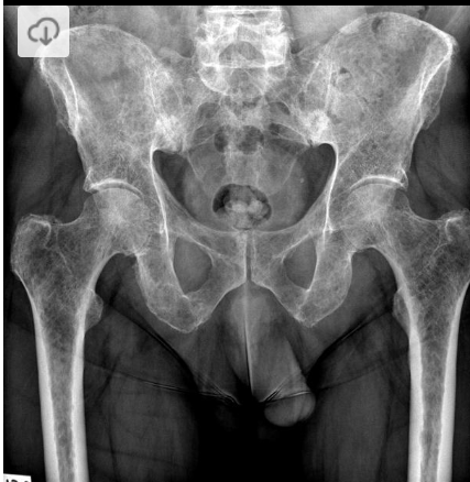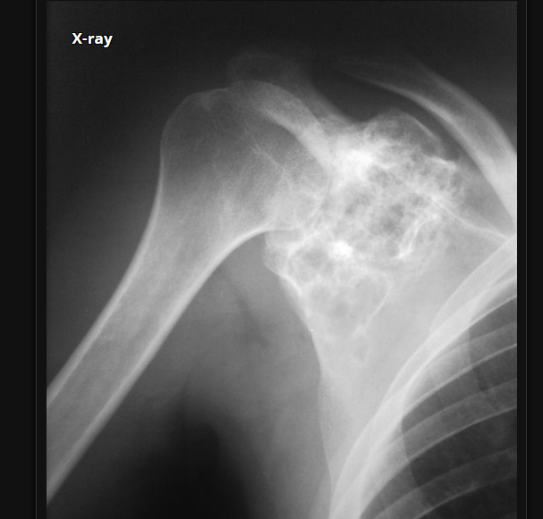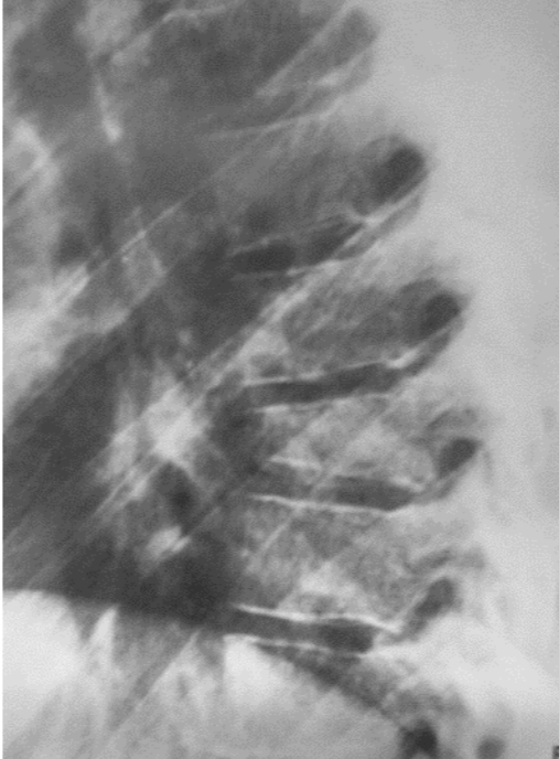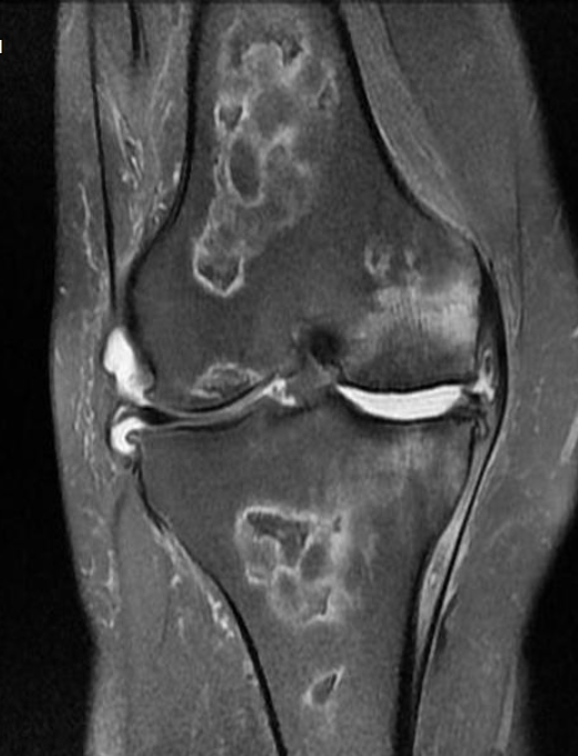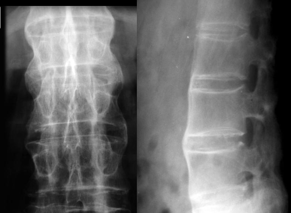 Pode apresentar como múltiplas lesões osteolíticas com recorte endosteal ou osteopenia generalizada com fraturas compressivas patológicas nas vértebras (poupa pedículo).