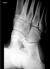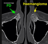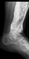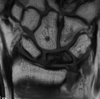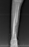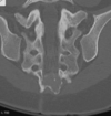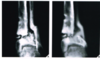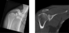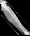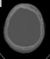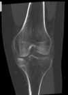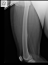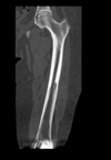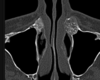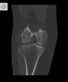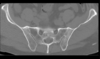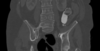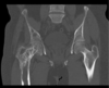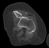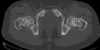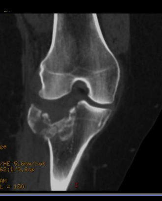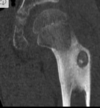 Osteoma Osteóide - A TC mostra o nidus radioluscente, cercado por reação esclerótica e , as vezes, pode mostrar um ponto esclerótico dentro do nidus.