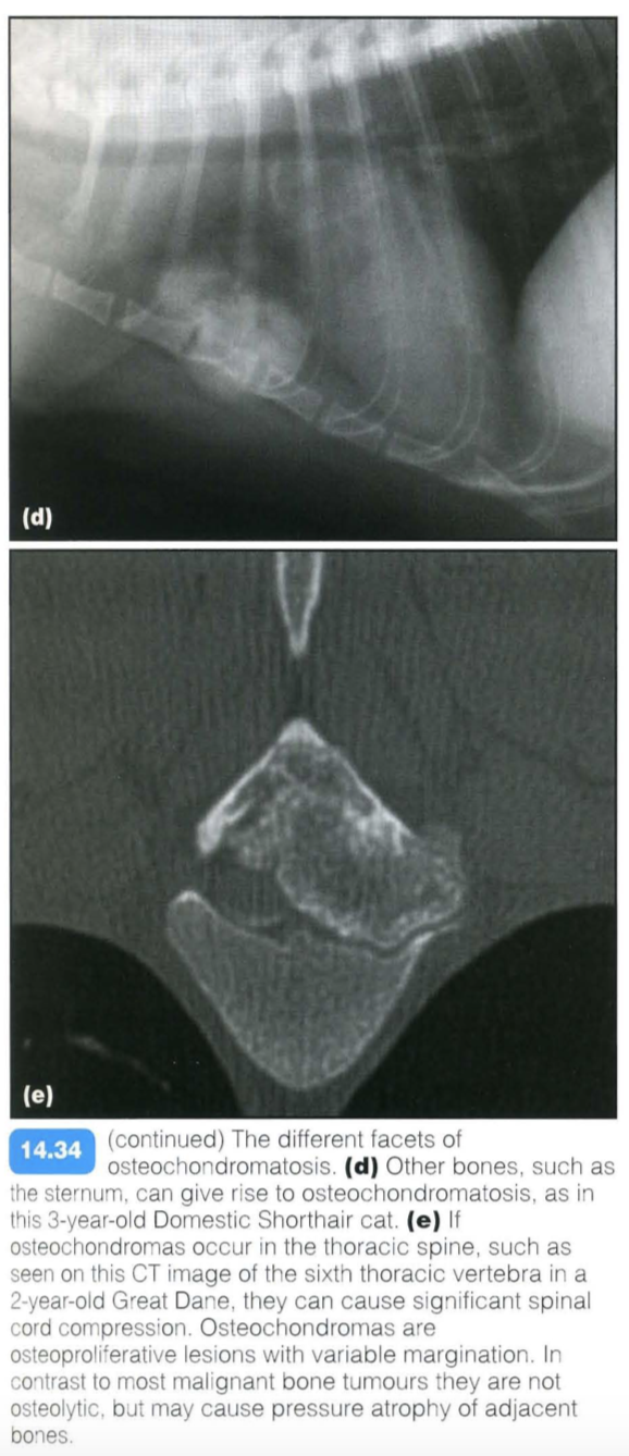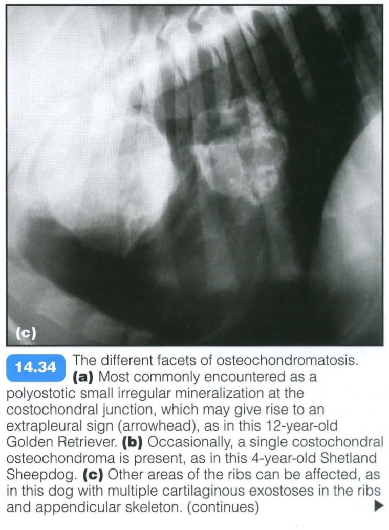 In rare cases malignant transformation may occur. Commonly affected areas are the costochondral rib junctions; less frequently, the metaphyses of the long bones and vertebrae may be involved. Small rib lesions are common in dogs, but rare in cats. The condition can affect multiple sites simultaneously (multiple cartilaginous exostoses).