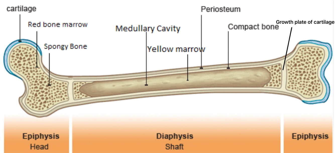 • Bone growth occurs at the growth plate, a cartilage layer between the epiphysis and diaphysis.