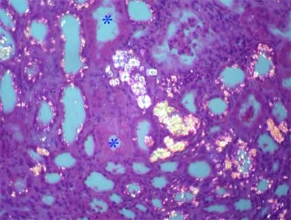 Slide: decomp man with elevated blood alcohol and this finding in kidney. Cause?