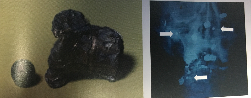 Xray of child’s head with small, radio-opaque round object (BB sized), ID.