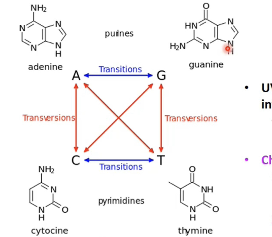 Transversions ( conversion of a purine to a pyrimidine or vice versa e.g A ⇒C/T)