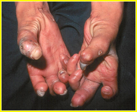 Cooler regions (skin of extremities, mucous membranes, eyes, *peripheral nerves*)