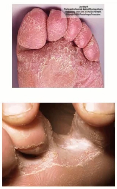 Causes fissures between toes and erythematous, scaly, pruritic rash along lateral and plantar surfaces of feet