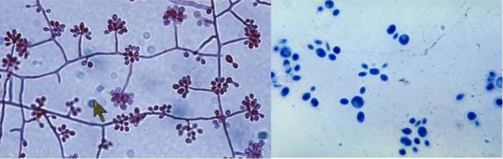 Clusters of thick-walled yeast cells mixed with hyphae