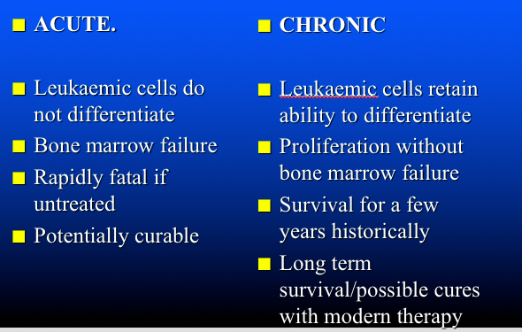 Acute - Bane marrow fills with cells that are failing to differentiate