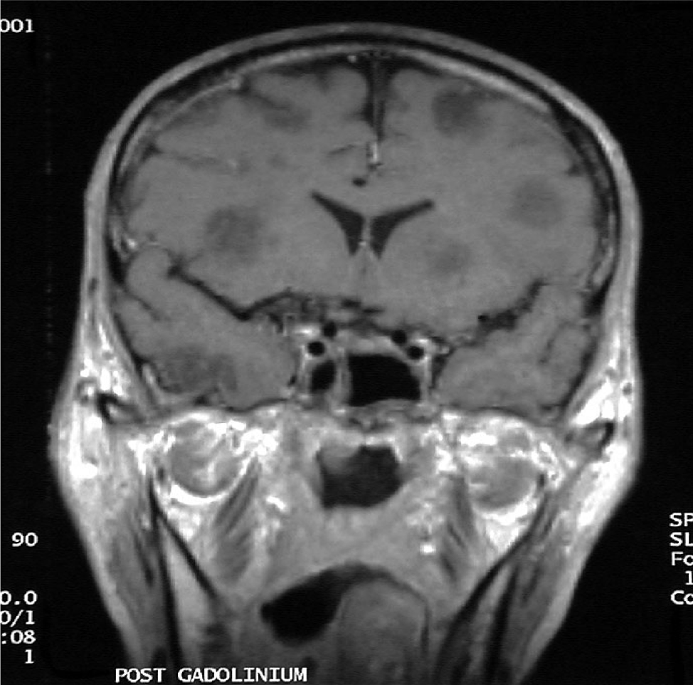Multiple fungal abscesses in AML – Brain MRI scan