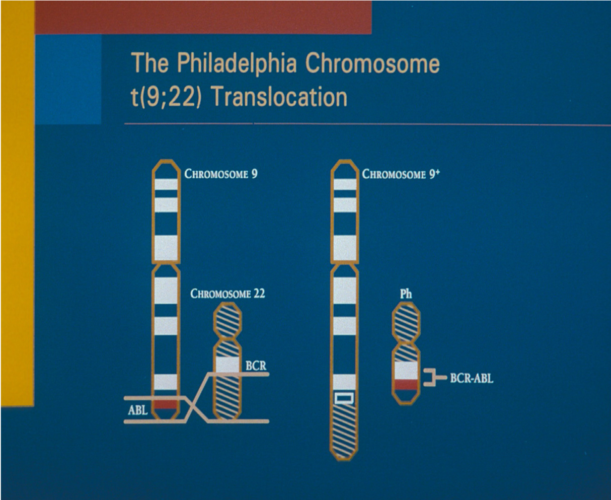 A bit of chromosome 9 is put on chromosome 22 and a bit of 22 is put on chromosome 9 so you have a big long chromosome 9 and a short chromosome 22 and this short chromosome puts together 2 genes which shouldn’t be together