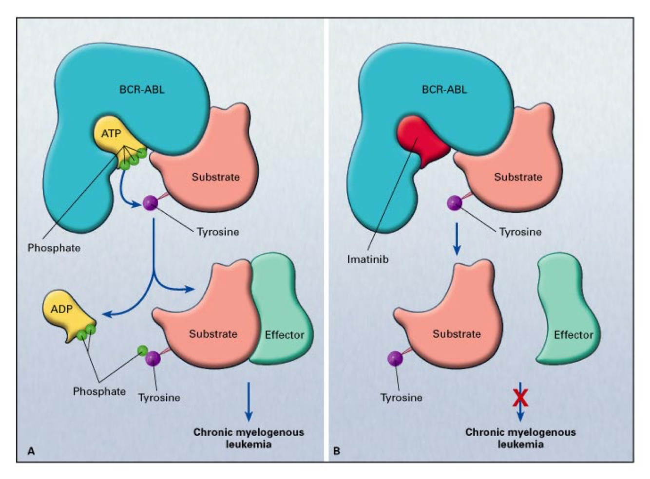 Uses ATP to put phosphate groups on downstream proteins - Inmatinib inhibit the blocks the phosphorylation process