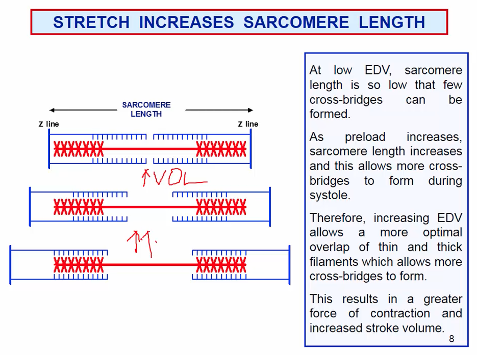 It states that stroke volume increases when preload increases. Associated with this law is the fact that there is a higher stroke volume not due to increasing [Ca] in the cardiac myocytes but because of the fact that there is an increased force of contratction due to stretching of the sarcomeres, there is more favourable overlap of thick and thin filaments.