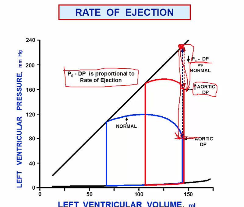 If the diastolic pressure in the aorta is increased then the volume of the ejected blood decreases as shown by the red curve. The reasoning beind that is P (zero) - DP is decreased (as shown by the really really red dot situated vertically above the diastolic pressure).