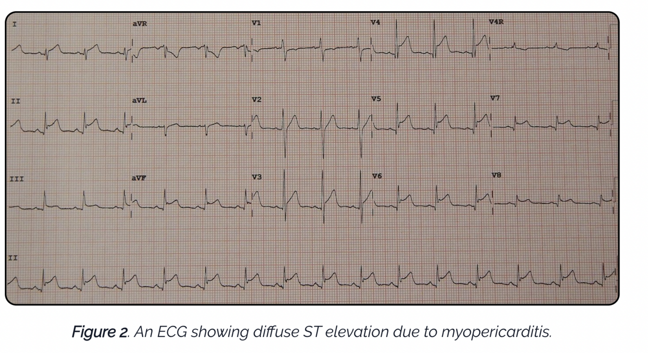 N.B. Suspect in young patient with cardiac-type chest pain with viral prodrome +/- palpiations or pericardial involvement