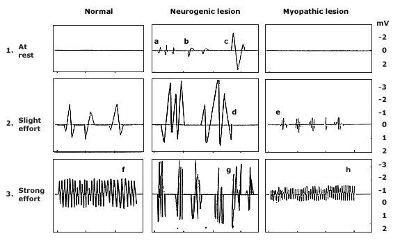 Short duration, polyphasic action potentials. Sometimes there may also be spontaneous fibrillation