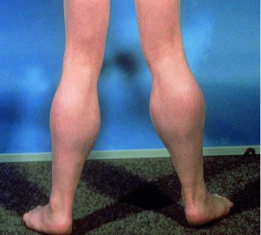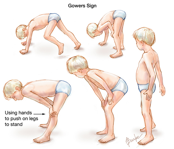 A patient that has to use their hands and arms to “walk” up their own body from a squatting position due to lack of hip and thigh muscle strength.