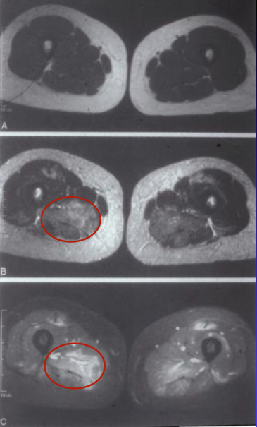 MRI shows increased edema in affected area of muscle - marker of inflammation