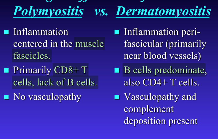 describe pathologic differences b/t polymyositis and dermatomyositis