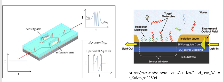 In a Mach-Zehnder interferometer, a change in the refractive index of a waveguide can change the phase in one of the MZI arms, and can be converted into a change in light intensity.