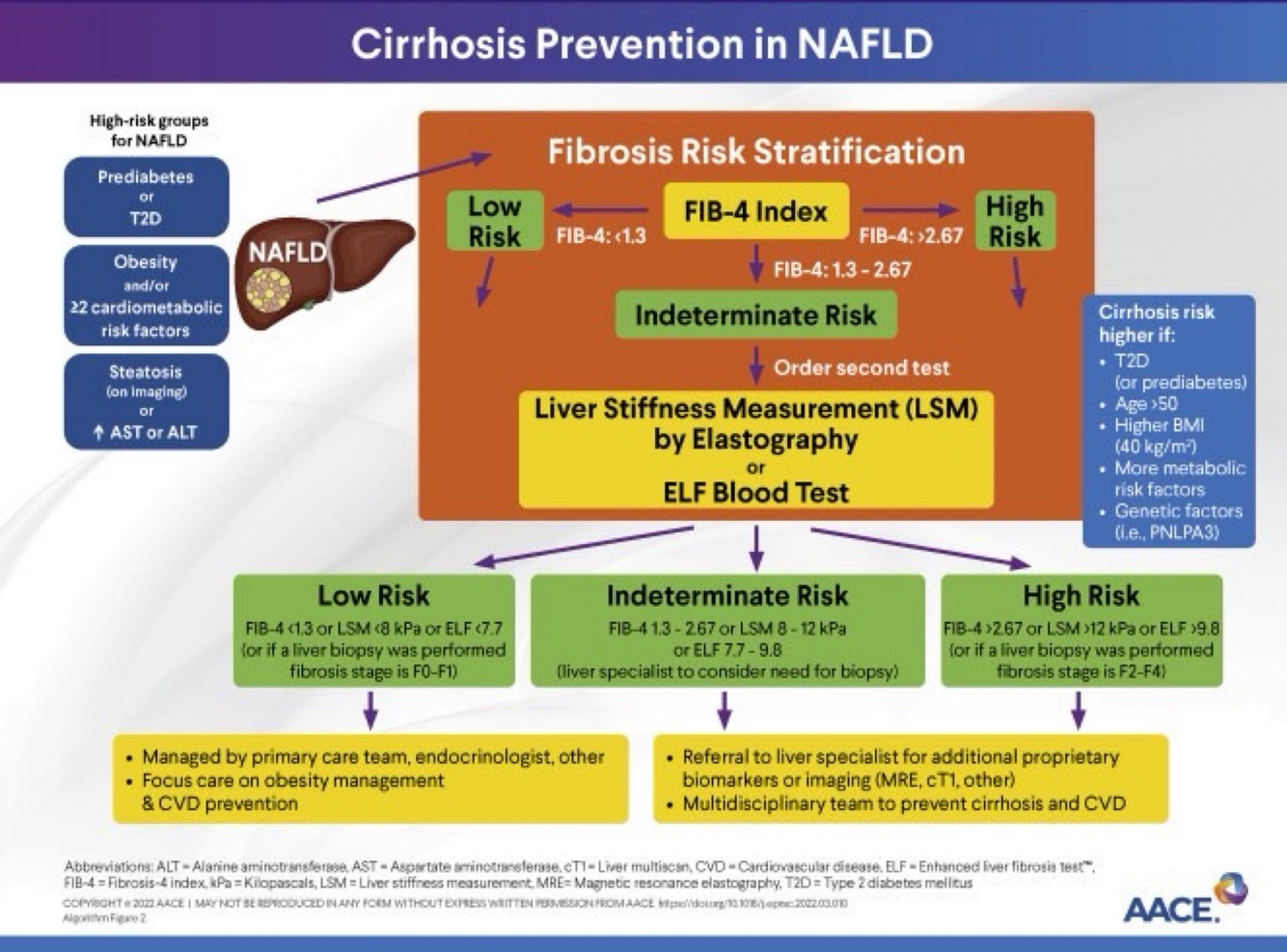 High-risk groups for NAFLD include prediabetes, type 2 diabetes (T2D), obesity, and/or 22 cardiometabolic risk factors.