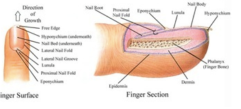 Hyponychium- skin immediately palmar to nail, at junction of sterile matrix and fingertip skin