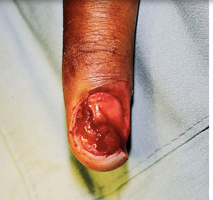 Treatment of a nail bed avulsion and physeal separation is irrigation and debridement, physeal reduction, nail bed repair and immobilization. The primary goals are to achieve a stable, viable nail and good cosmetic results.