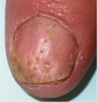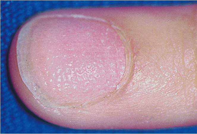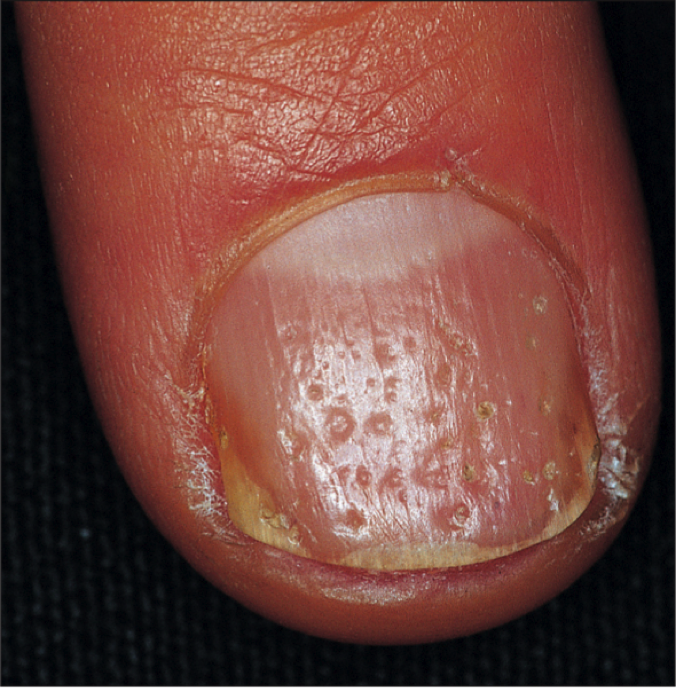 nail sign due to abnormal matrix function: this is a punctate depression of the nail plate surface