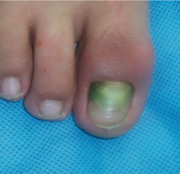 Nail is discolored because of pyocyanin, a blue–green pigment produced by Pseudomonas aeruginosa.