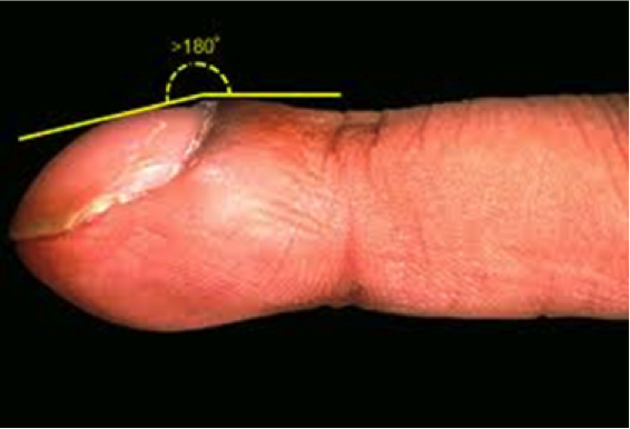Lovibond’s angle: angle between the proximal nail fold and the nail plate