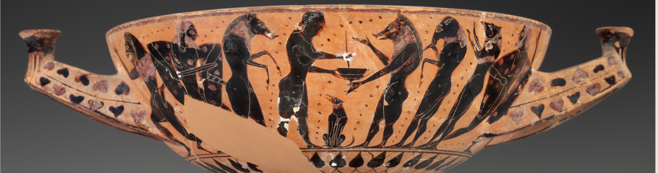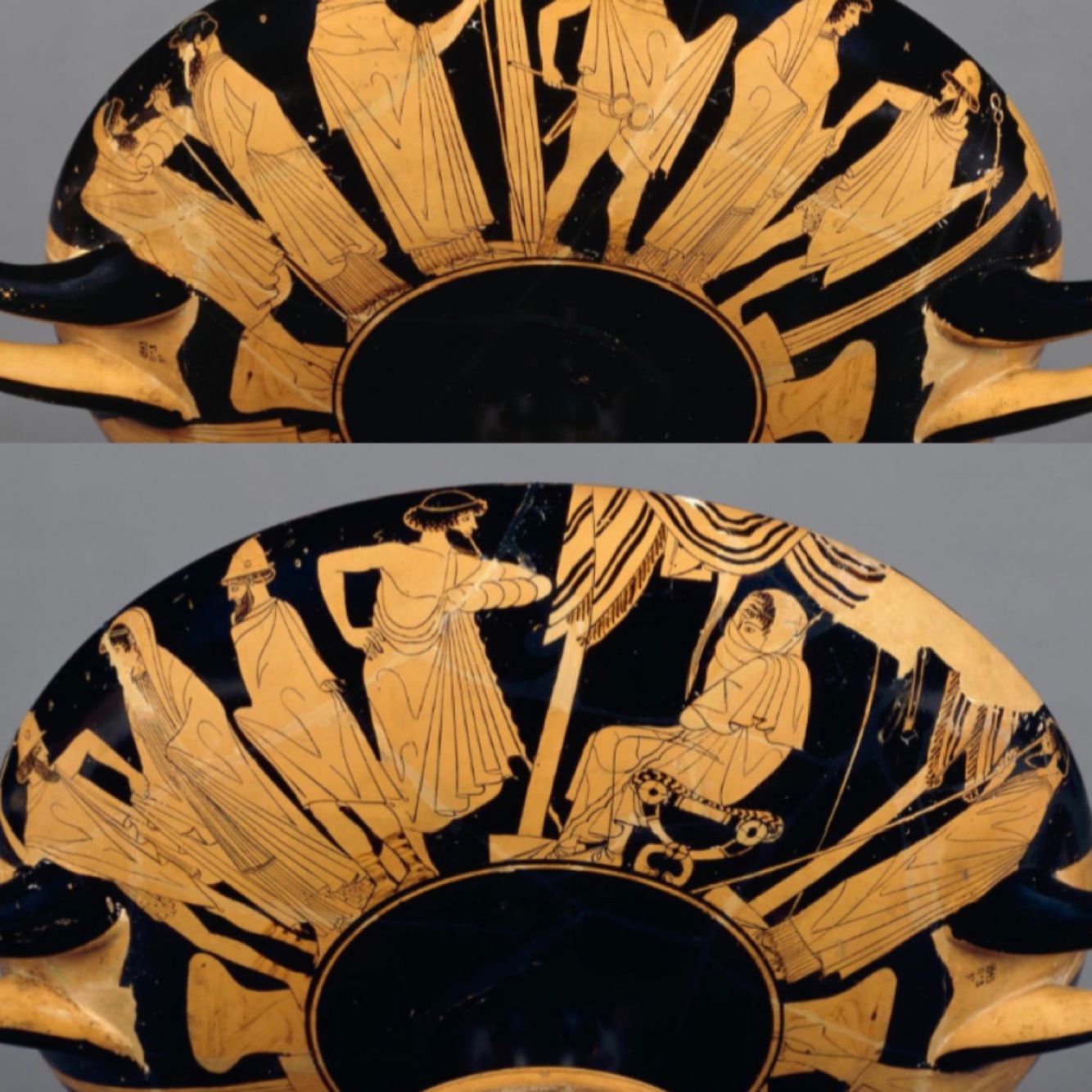 * Synoptic narrative: shows Circe distoring Zenia (host exchanging gifts to visitors) by turning guests in animals, one escaping to report to Odysseus (far right), and Odysseus holding a sword (far left)