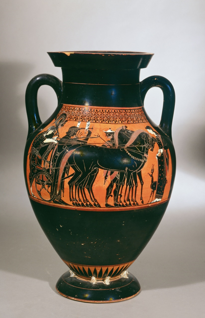 * Homer’s Iliad: Briseis being taken away to be a concubine with wrist grabbed by herald, Achilles being seated in wartent with a mourning gesture to Briseis