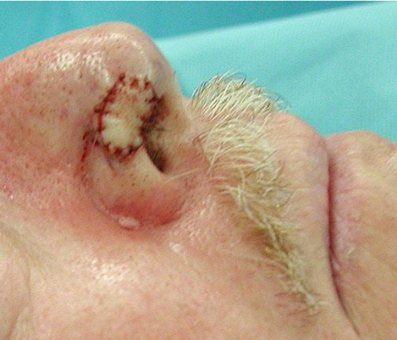 The closure of Mohs defects of the nose is typically guided by subunit reconstruction and using tissue of like quality and color. Small defects can be attempted primarily, but the tip of the nose will usually require a local transposition flap (bilobed, rhomboid), V-Y advancement, or other similar tissue transposition.
