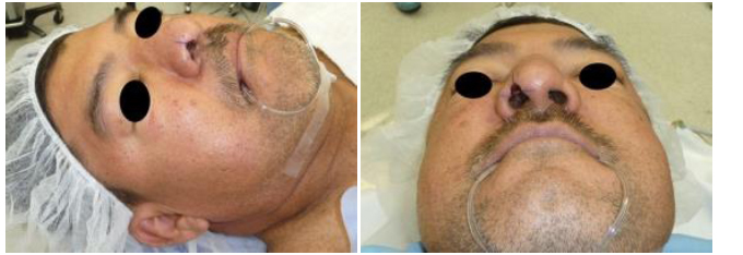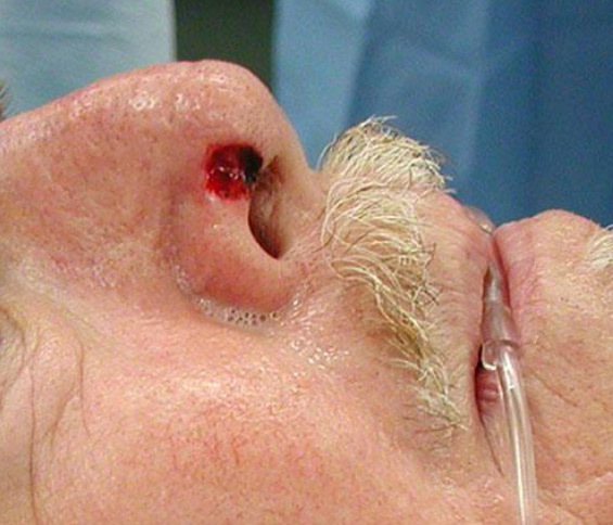 In considering nasal reconstruction, the surgeon must adequately describe the location of the defect since it is important in choosing a reconstructive method. The classically described nasal subunits, based on location, include the ala(s), tip, soft triangle(s), sidewall(s), and dorsum. The current defect is limited to the nasal side wall.