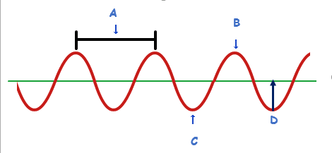 Amplitude (A) is the height of a wave from the middle (line of zero disturbance) to the top (crest), or from the bottom (trough) to the middle.