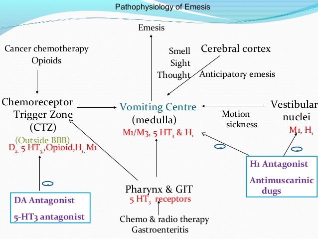 . Histamine (H1) and acetylcholine (muscarinic) receptors predominate in the vomiting centreand in its communication with the vestibular system. Drugs such as cyclizine block both of these receptors.