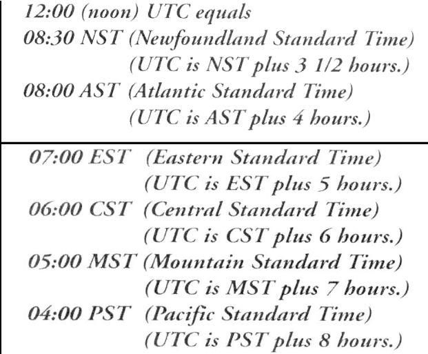 What is 12:00 (noon) UTC in NST, AST, EST, CST, MST, and PST?
