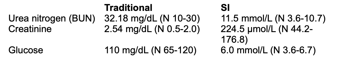 A 12-year-old spayed female Persian cat is evaluated because of a one-week history of anorexia, vomiting, polyuria, and polydipsia. Body condition score is 3/9. Physical examination shows lethargy and enlarged, irregular kidneys bilaterally. Serum studies show: