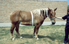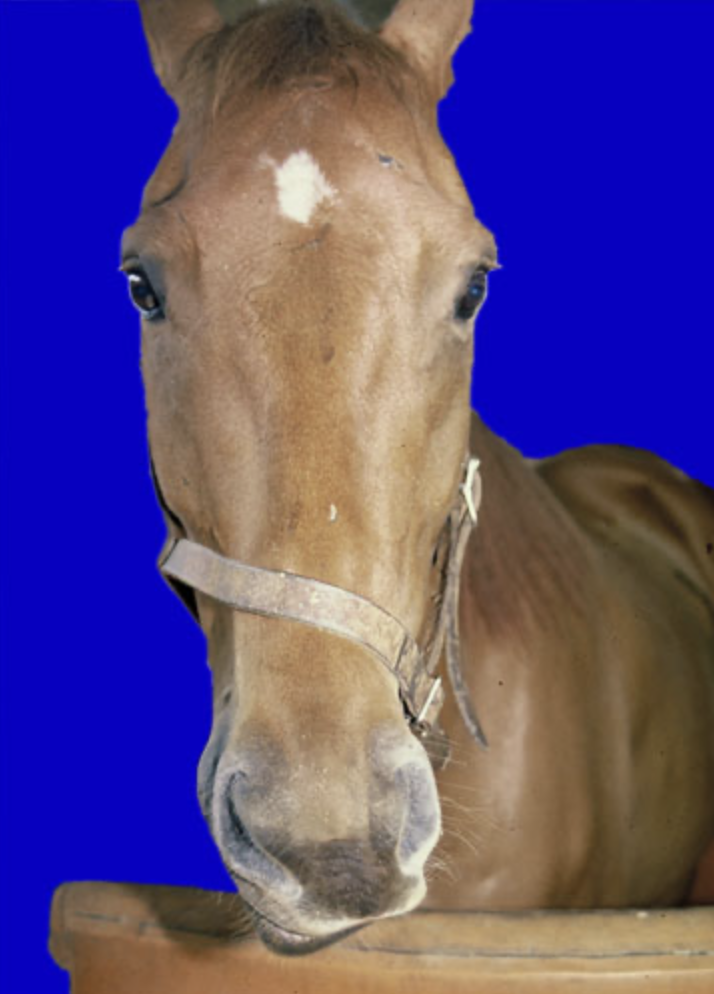 A 3-year-old Percheron mare is undergoing routine dental evaluation. Physical examination shows bilateral prolapse of the nictitating membrane and muscle fasciculations of the neck, shoulders, and flank. During examination, the mare’s hindlimb give way, and she leans back in a dog-sitting posture. Rectal temperature is 100.4 F, heart rate is 60 beats/min, and respiratory rate is 30 breaths/min. Laboratory studies show: