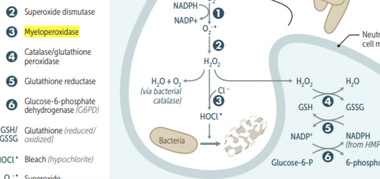 Catalase (in phagolysosome) and glutathione peroxidase (in neutrophil)