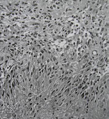 A. Sel tegak (palisading) di sekeliling daerah nekrosis pada pasien dengan glioblastoma.