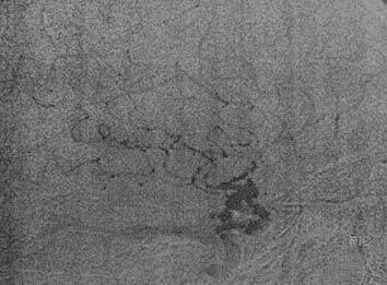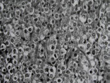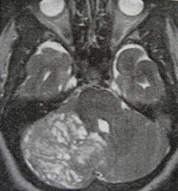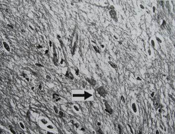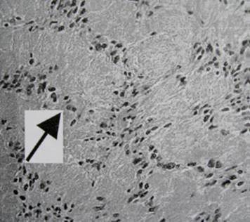 33.Seorang laki-laki gemuk usia 28 tahun dibawa dengan riwayat sakit kepala dan diplopia selama dua bulan terakhir. Ternyata pasien mengalami lesi sebagaimana yang ditunjukkan pada fotomikrograf di bawah in. Apakah yang dijelaskan oleh tanda panah pada fotomikrograf tersebut?