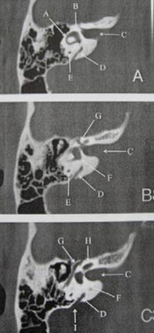 Petunjuk: Jodohkanlah struktur-struktur di bawah ini dengan huruf jawaban yang tepat pada CT scan aksial di bawah ini dari tulang Temporal Petrosus kanan