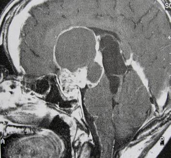 Petunjuk: Seorang laki-laki usia 16 tahun dengan hasil MRI sebagaimana ditunjukkan di bawah ini, dirujuk ke kantor anda. Hasil pemeriksaan laboratorium pasien mengungkapkan bahwa dia menderita hipotirodisme, kekurangan kortisol dan kadar prolaktin sebesar 69. Keluarganya mengatakan bahwa mereka mencatat adanya berbagai perubahan perilaku dan baru-baru ini mengalami kenaikan berat badan. Mata kirinya tidak bisa melihat dan lapang pandangan temporal mata kanannya terputus.