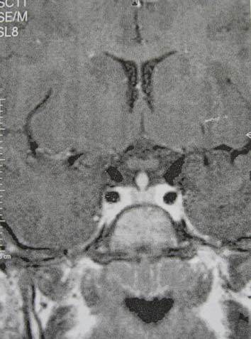 adanya berbagai perubahan perilaku dan baru-baru ini mengalami kenaikan berat badan. Mata kirinya tidak bisa melihat dan lapang pandangan temporal mata kanannya terputus.