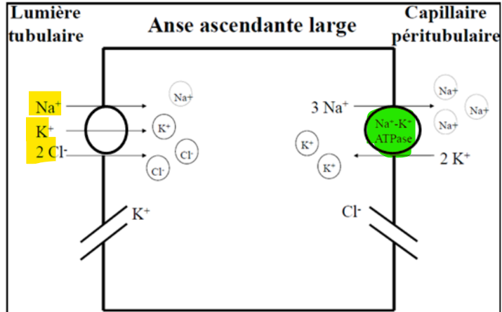 Les cellules de l’anse large ascendante de Henle assurent le transport (?) du NaCl de la lumière tubulaire vers l’interstitium de la médullaire.