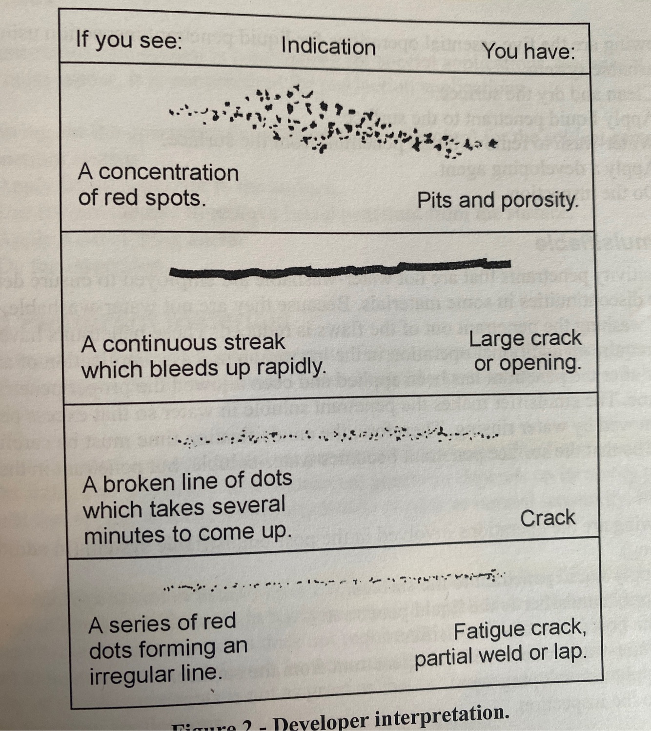2: apply a penetrating coloured liquid dye to the surface of the test piece. Should be left on long enough to along sufficient penetration. (Dwell)