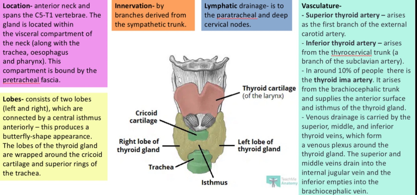 The right and left recurrent laryngeal nerves are visible as they originate in (the right recurrent laryngeal nerve), or pass through (the left recurrent laryngeal nerve), the root of the neck.