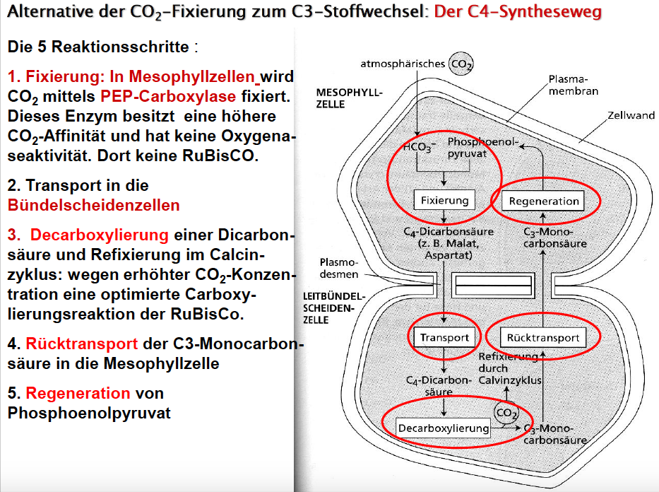 Im Verlauf der Evolution hat die RuBisCo bei C4-Pflanzen durch Mutationen ihre doppelte katalystische Funktion als Carboxylase und Oxygenase verloren. Das erklärt die hohe Effizienz der CO2-Bindung und deren hohe Phtosyntheseleistung.