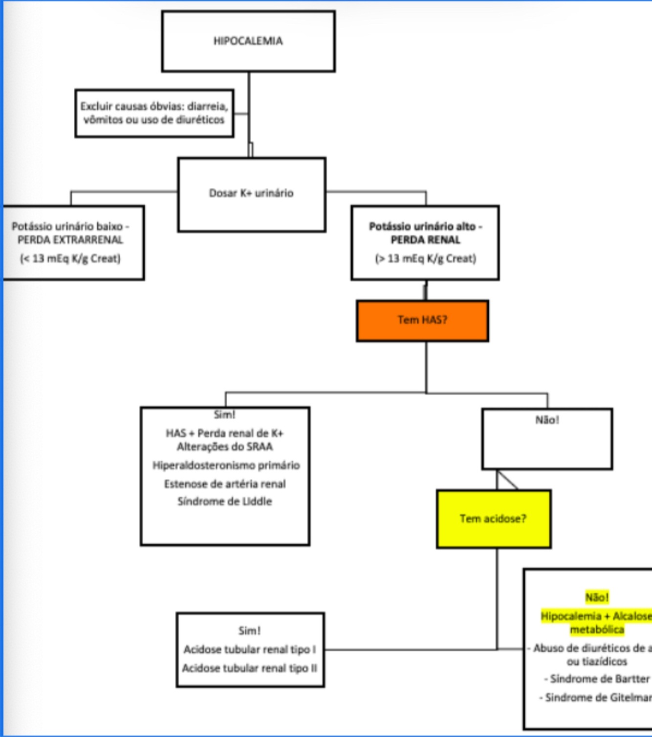 excluir hipotireoidismo, medicaçoes (tiazidicos), insuficiencia renal, insuficiencia adrenal