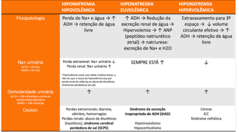 – hipovolemia cursa com sodio urinario baixo, exceto em perdas renais: sodio urinario alto se SCPS ou abuso de diuretico