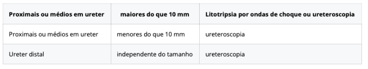 - >10mm: se proximal ou medio do urreter litotripsia, se distal ou proximal/medio mas <10mm ureteroscopia